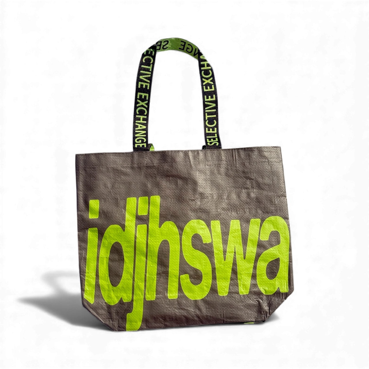 Recyclable designer tote bags built for everyday carry with a bold statement. Crafted from durable tarp material, these totes are lightweight, water-resistant, and designed to last. Each bag features SELECTIVE EXCHANGE branded straps and oversized IDJHSWA lettering for a striking graphic look.